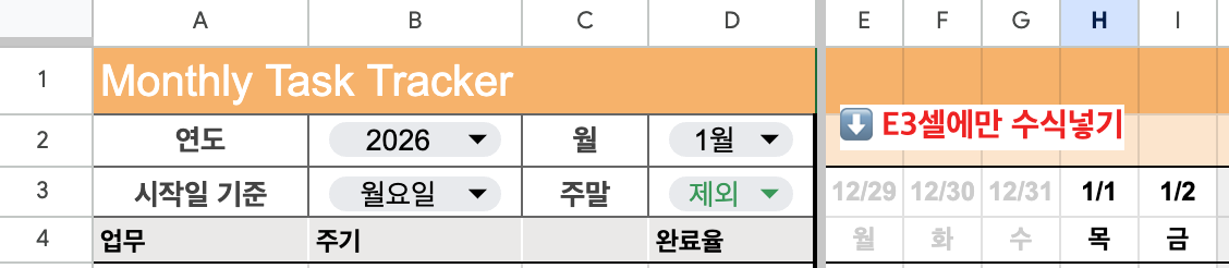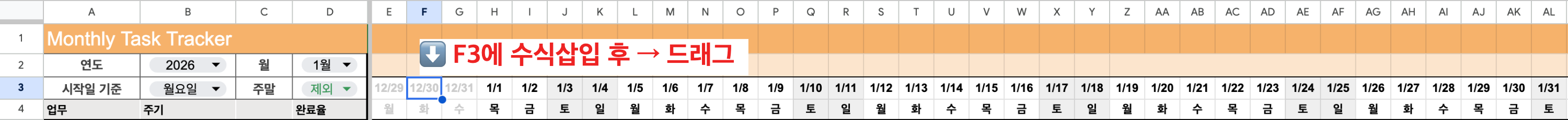 그래서 그동안 참고해 왔던 간트차트나 다양한 스케줄 시트의 레이아웃을 바탕으로, 필요한 기능을 직접 조합해서 만들어 보기로 했습니다. 제 시트의 핵심은 "연도와 월만 바꾸면 날짜와 요일이 자동으로 기재되고, 시작 요일과 주말 포함 여부까지 선택 가능"한 부분입니다.