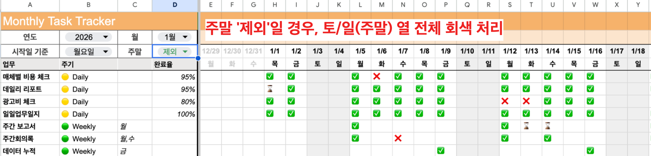 D3(주말 포함 여부)가 "제외"일 때, 토/일(주말) 열 전체의 배경색을 자동으로 바꿉니다.