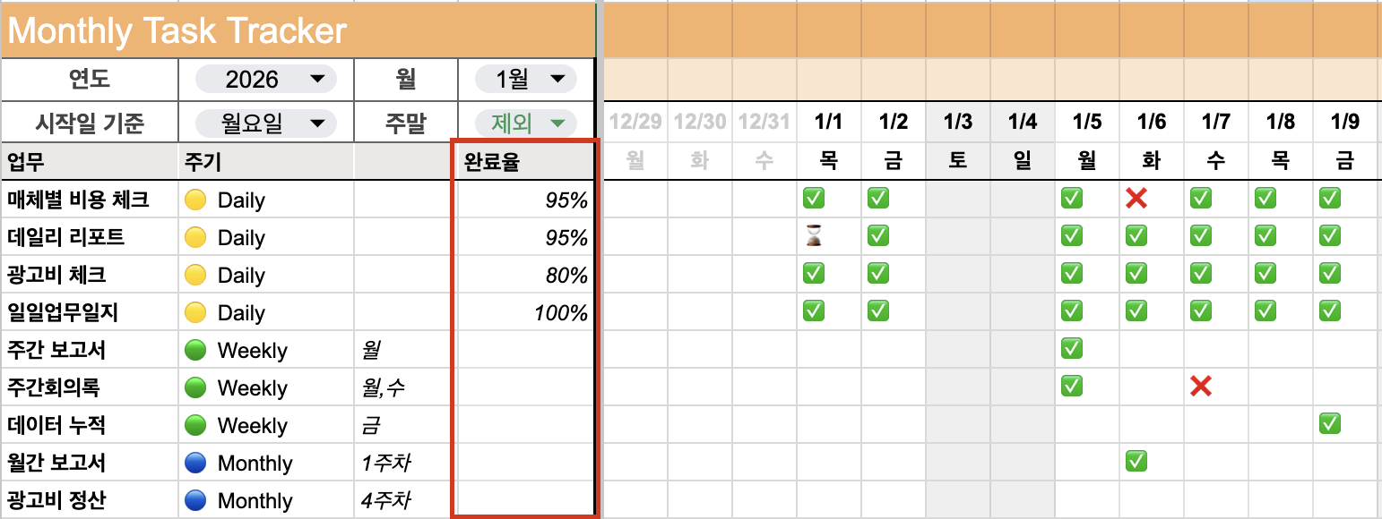 | Weekly / Monthly | 빈칸 | 주 1회, 월 1회 업무의 일별 완료율은 의미 없음 |